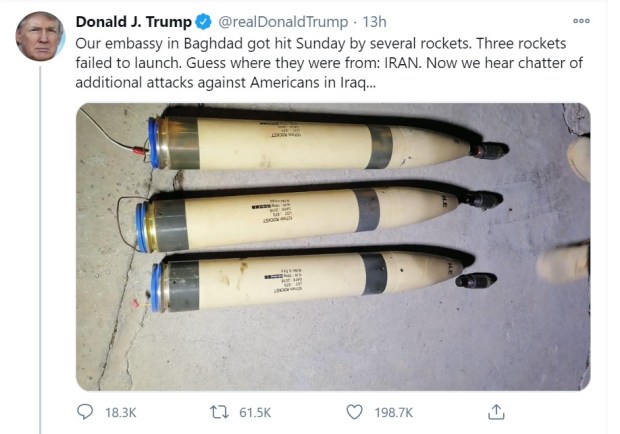 ترامپ روز چهارشنبه ۳دی در توئیتی با اشاره به حمله روز یکشنبه به منطقه سبز بغداد عکسی از سه راکت مورد استفاده در این حمله را منتشر کرد و نوشت: سه تا از راکتها منفجر نشدند. حدس بزنید از کجا آمده بودند: ایران. و حالا حرف از حملات دیگری علیه آمریکاییها در عراق میشنویم.