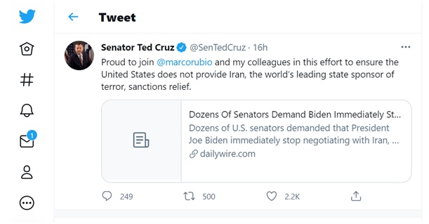 سناتور تد کروز روز ۲۵شهریور در توئیتی برای ممانعت از لغو تحریمهای رژیم ایران توسط دولت بایدن نوشت که به مارکو روبیو میپیوندند.
