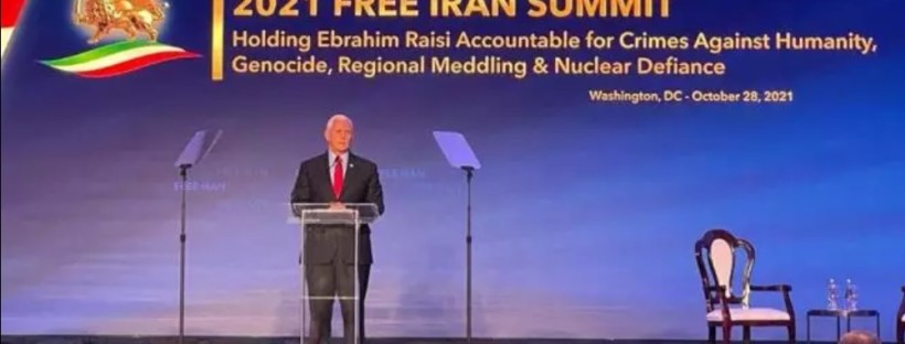 پنس در کنفرانسی که توسط شورای ملی مقاومت ایران در واشنگتن برگزار شد، گفت: «وقتی دولت ما دورهٔ خود را شروع کرد، (رژیم) ایران از رویکرد دولت بایدن و اوباما در رابطه با برجام، و دادن پالتهای پول نقد بهآخوندها در ایران و و رفع تحریمها سود برده بود.