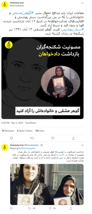 عفو بینالملل طی پیام توئیتری پنجشنبه ۱۳آبان از مقامات رژیم ایران خواست، گوهر عشقی و خانوادهاش را که در پی بزرگداشت ستار بهشتی و فعالیتهای عدالتخواهانه در تاریخ ۱۲آبان بازداشت شدند، فوراً و بدون قید و شرط آزاد کنند.