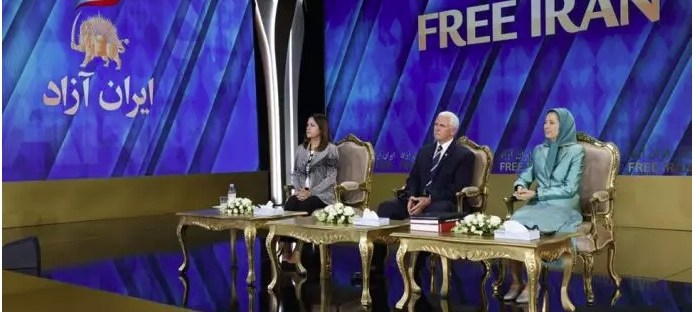 پنس با مریم رجوی رئیس جمهور منتخب شورای ملی مقاومت ایران و با کسانی که در این کشور از نقض حقوقبشر رنج میبرند ملاقات و سپس در جمع فعالان سخنرانی کرد و مبارزات آنها را ستود و به آنها گفت که مردم آمریکا در کنار آرمان آنها ایستادهاند. او در همین حال به خروج از برجام توسط دولت ترامپ در سال۲۰۱۸ نیز اشاره کرد.