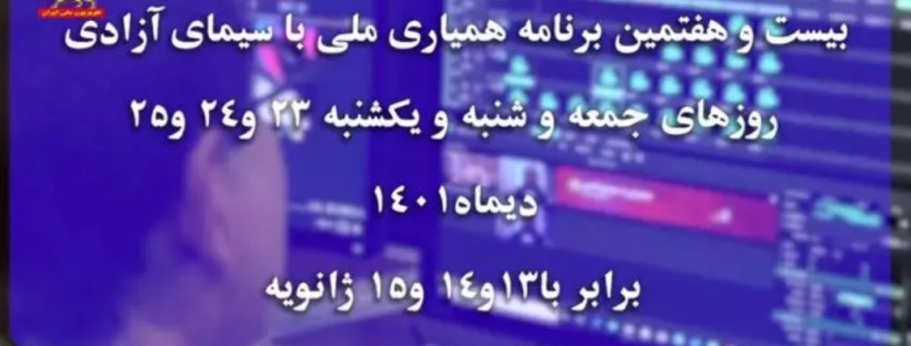 روابط عمومی سیمای آزادی- تلویزیون ملی ایران، با درود به شهیدان سرفراز انقلاب دموکراتیک مردم ایران و خیزشهای زنان پیشتاز و جوانان سرفراز قیام، که سراسر کشور را در برگرفته است، برگزاری بیست و هفتمین برنامه همیاری ملی با سیمای آزادی را در روزهای جمعه و شنبه و یکشنبه ۲۳و۲۴و۲۵دیماه ۱۴۰۱ برابر با ۱۳و۱۴و۱۵ ژانویه۲۰۲۳، به اطلاع هموطنان میرساند.