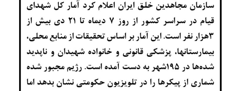 - سازمان مجاهدین خلق ایران اعلام کرد آمار کل شهدای قیام در سراسر کشور از روز ۷ دیماه تا ۲۱ دی بیش از ۳هزار نفر است