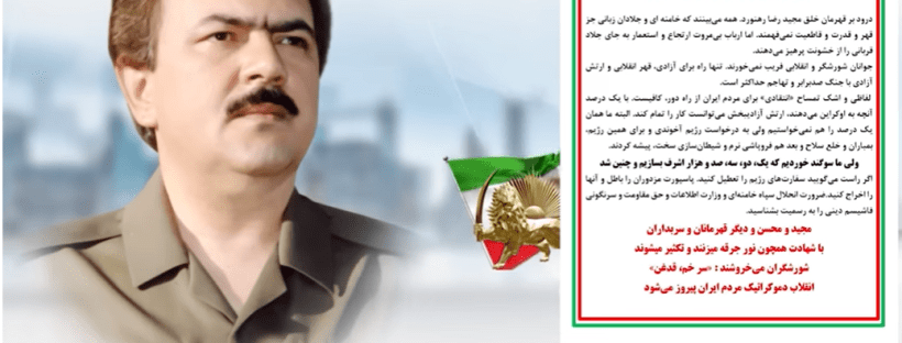 1402/01/21 قیام سراسری مردم ایران روز دوشنبه بیستویکم فروردین ۱۴۰۲، همزمان با دویستوهفتمین روز قیام سراسری مردم ایران است. تاکنون تظاهرات و قیام سراسری در بیش از ۲۸۲شهر با ۷۵۰شهید و ۳۰۰۰۰دستگیری بهثبت رسیده است. تاکنون اسامی و مشخصات ۶۷۵تن از شهیدان قیام از سوی سازمان مجاهدین اعلام شده است. تهران - طنین شعارهای مرگ بر دیکتاتور در منطقه … ادامه خواندن دویستوهفتمین روز قیام سراسری – طنین شعارهای مرگ بر دیکتاتور و مرگ بر خامنهای در تهرانپارس و شهرک باقری