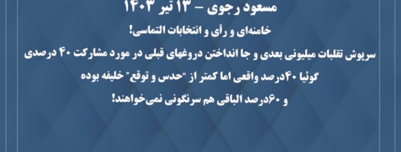 1404/04/20 درخواست برگزاری رفراندم توسط میرحسین موسوی سر باز کردن سریع السیر تضادها در سرتاپای رژیم پس از نمایشات زودگذر وحدت ملی در مرحله پایانی درخواست برگزاری رفراندم برای تأسیس مجلس مؤسسان و تغییر قانون اساسی رژیم از سوی میرحسین موسوی نخستوزیر پیشین نظام میرحسین موسوی که از سال ۱۳۸۹ تاکنون به دستور … ادامه خواندن سر باز کردن سریع السیر تضادها در سرتاپای رژیم پس از نمایشات زودگذر وحدت ملی در مرحله پایانی