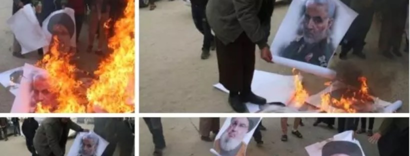 به آتش کشیدن تصاویر منحوس خامنهای، حسن نصرالله و جلاد خلقهای منطقه دژخیم قاسم سلیمانی
