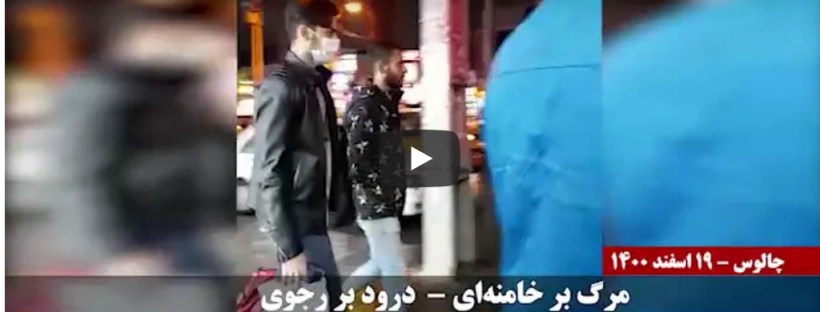 1400/12/19 پخش شعارهای مرگ بر خامنهای درود بر رجوی، مرگ بر خامنهای رئیسی، لعنت بر خمینی، تنها ره رهایی سلاح و سرنگونی در بلوار شهر چالوس - ساعت ۱۹۰۰ پنجشنبه ۱۹اسفند