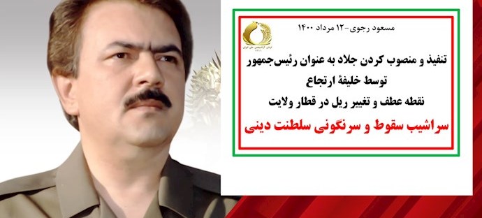 1400/05/13 پیام مسعود رجوی رهبر مقاومت ایران مسعود رجوی - ۱۲مرداد ۱۴۰۰ تنفیذ و منصوب کردن جلاد بهعنوان رئیسجمهور توسط خلیفهٔ ارتجاع نقطهٔ عطف و تغییر ریل در قطار ولایت سراشیب سقوط و سرنگونی سلطنت دینی