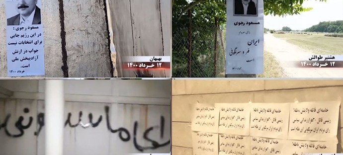 تخریب و آتش زدن پوسترهای کاندیداهای شعبده انتخاباتی خامنهای در شهرهای مختلف میهن توسط قهرمانان کانونهای شورشی