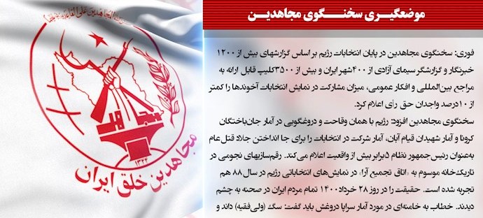 1400/03/29 سخنگوی مجاهدین فوری: سخنگوی مجاهدین در پایان انتخابات رژیم بر اساس گزارشهای بیش از ۱۲۰۰خبرنگار و گزارشگر سیمای آزادی از ۴۰۰شهر ایران و بیش از ۳۵۰۰کلیپ قابل ارائه به مراجع بینالمللی و افکار عمومی، میزان مشارکت در نمایش انتخابات آخوندها را کمتر از ۱۰درصد واجدان حق رأی اعلام کرد. سخنگوی مجاهدین افزود: رژیم با همان … ادامه خواندن سخنگوی مجاهدین: خطاب به خامنهای در مورد آمار سراپا دروغش باید گفت: سگ (ولیفقیه) داند و پینهدوز در انبان چیست!